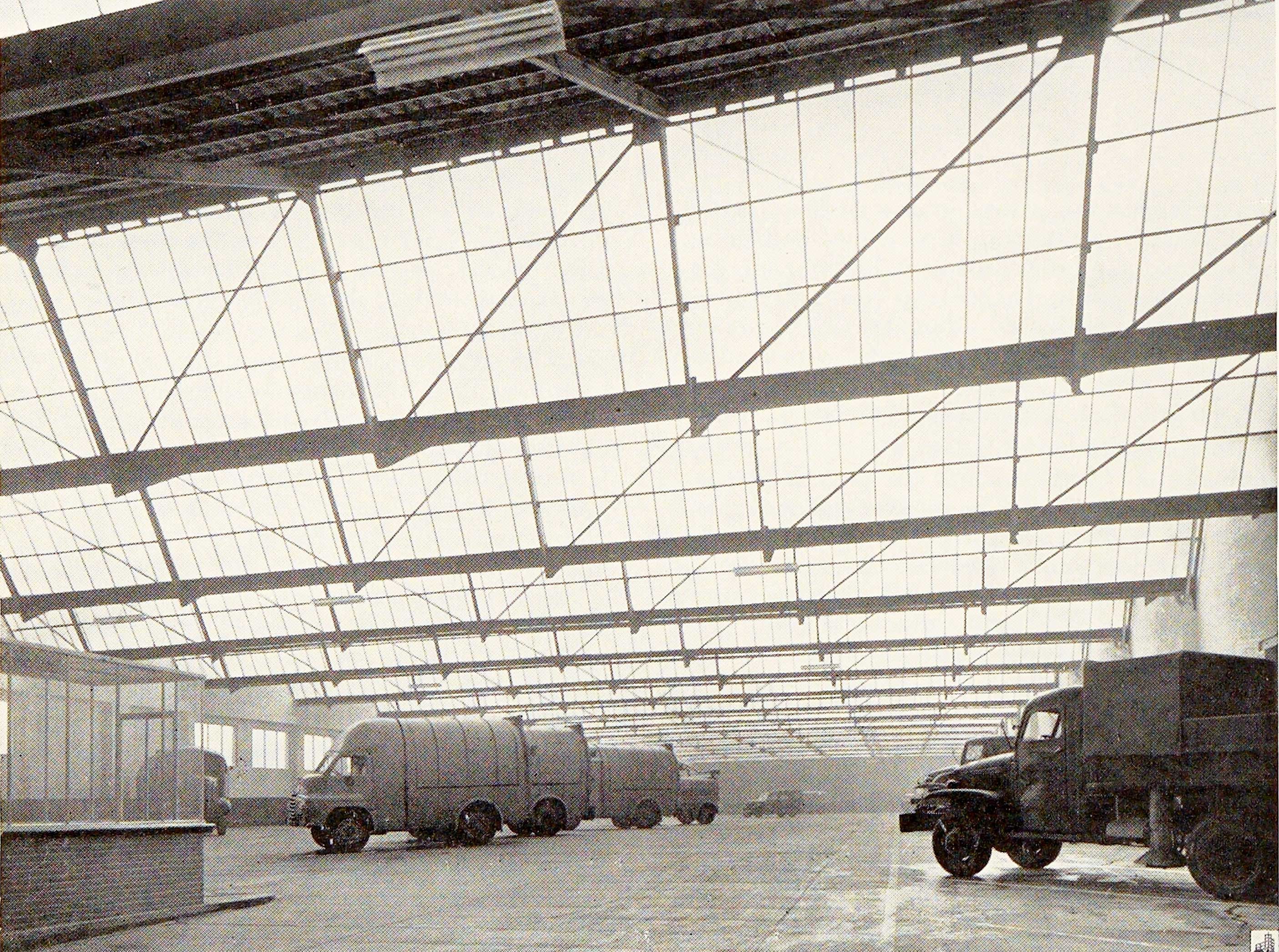 De nieuwe garage voor de wegendienst van de Stad Brussel. De Stad Brussel heeft onlangs een garage gebouwd voor haar wegendienst aan de Fabriekskaai. Het gebouw bestaat uit een trapeziumvormige hoofdhal van 113,50 m lang en 36,28 m en 28,40 m breed, plus een bijgebouw. Het dak van de grote hal wordt ondersteund door een Raikem-staalstructuur, type ‘Robert et Musette’. De spanten hebben een opening van 6,66 m en de dwarsbalken zijn gemaakt van ijzer UPN 18 voor de hellingen van 30° en UPN 16 voor de hellingen van 60°. Het daglicht wordt overvloedig verspreid dankzij de grote glas­oppervlakken.
