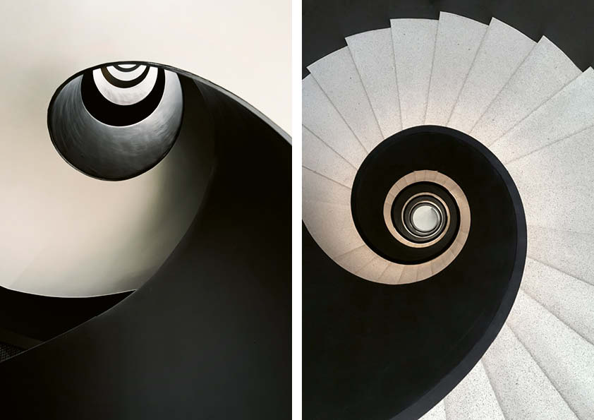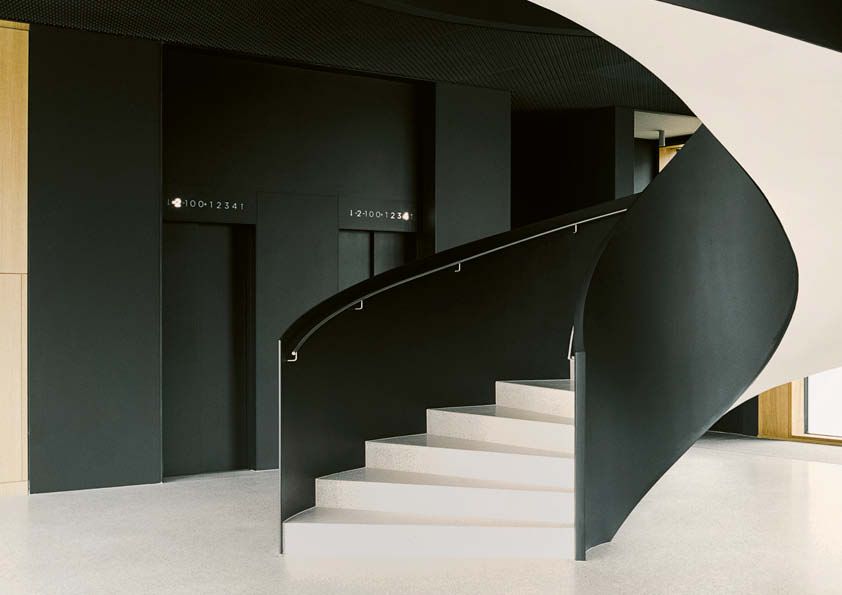 In een nieuw kantoorgebouw van vijf verdiepingen in Luxemburg-Kirchberg pronkt een sculpturale trap met een vloeiende spiraalvorm, in een zachte donkere kleur, met lichte terrazzotreden en verlicht door een verticaal geplaatste ronde koepel. De leuning van deze wenteltrap, die tevens dienstdoet als noodtrap, bestaat integraal uit staal. De treden zijn ter plaatse gerealiseerd in gewapend beton. Er werd een sjabloon getekend op flexibele houten platen, waarna de leuning in verschillende delen werd vervaardigd uit 15 mm dik plaatstaal en in het atelier op maat gebogen werd. Vervolgens is ze naar de werf getransporteerd en onzichtbaar tegen de betonnen treden bevestigd. Tot slot zijn de afzonderlijke delen ter plaatse gemonteerd, geschuurd en gelakt (RAL 8022). De algemene en indirecte verlichting van de trap, die ook fungeert als noodverlichting, wordt verzorgd door een ledstrook die geïntegreerd is in de leuning met een diameter van 20 mm.